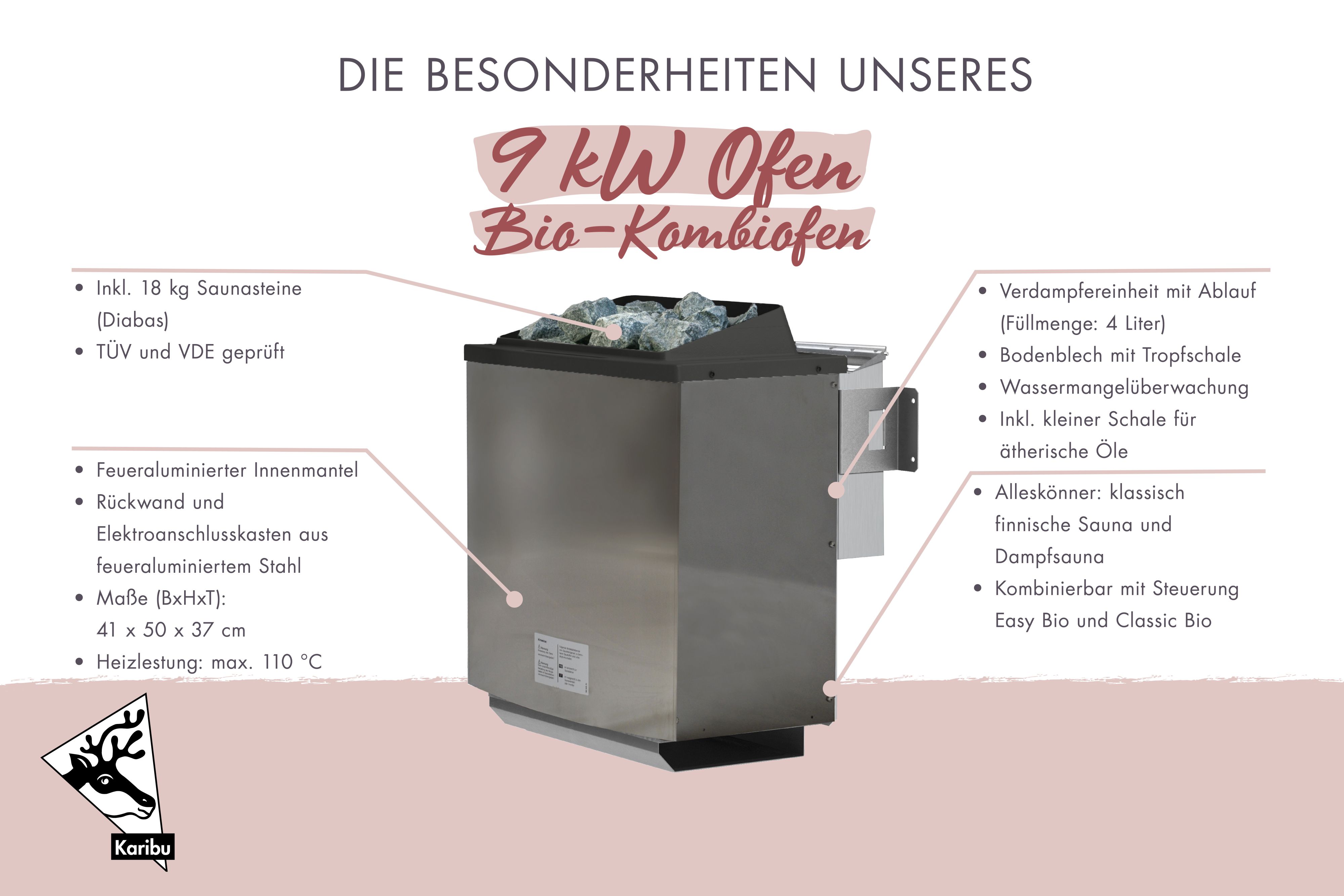 - Ofentyp: Bio-Kombiofen – für finnische & BIO-Sauna (höhere Luftfeuchtigkeit / Feuchtsauna)