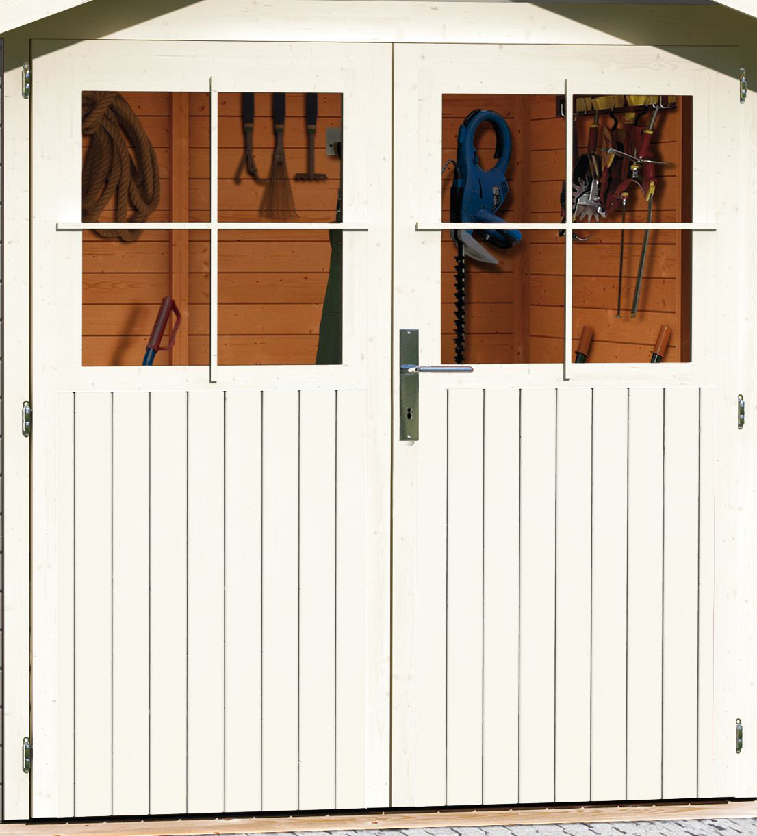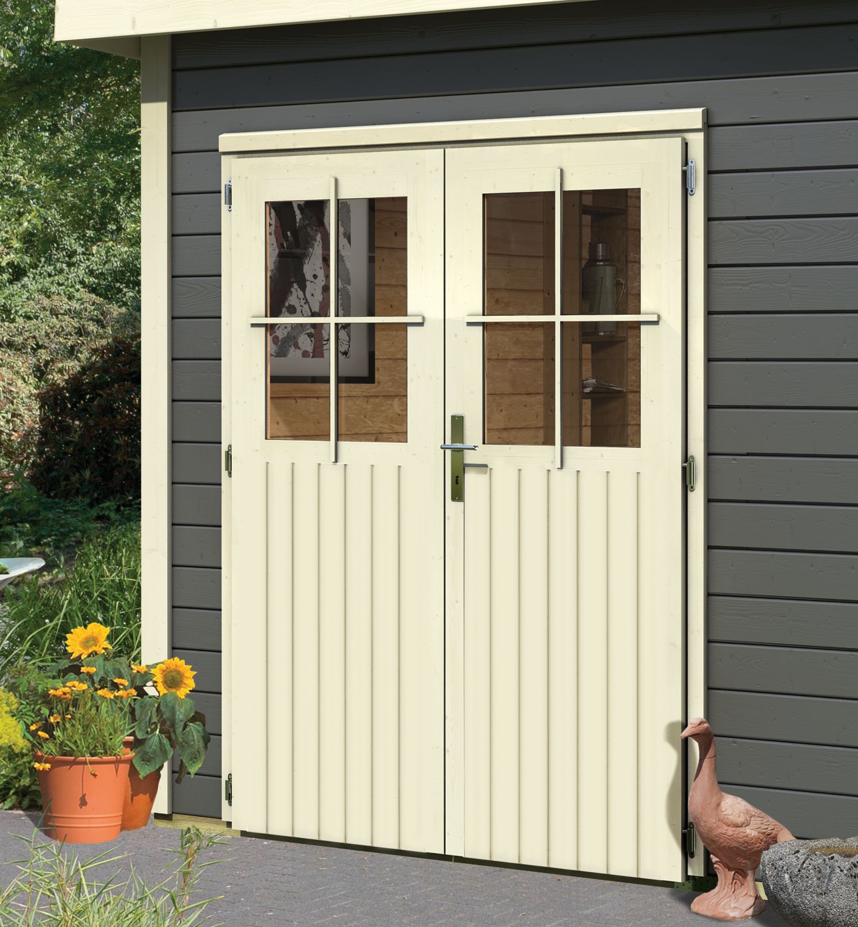 Passen Sie Ihr Gartenhaus Ihren Gegebenheiten an. Die Doppelflügeltür für Gartenhäuser mit einer Wandstärke von 28 mm hat ein Außenmaß von (BxH) 141 x 177 cm. Die Tür wird inklusive eines Türrahmens geliefert. Verschlossen werden kann die Doppelflügeltür mithilfe eines Buntbartschlosses inklusive zwei Schlüsseln. Die Tür besitzt einen Lichtausschnitt je Türflügel aus Kunstglas und ist in elfenbeinweis (RAL 1015) lackiert erhältlich. Passen Sie Ihr Gartenhaus nach den eigenen Gegebenheiten an mit der Doppelflügeltür für 28 mm Wandstärke.