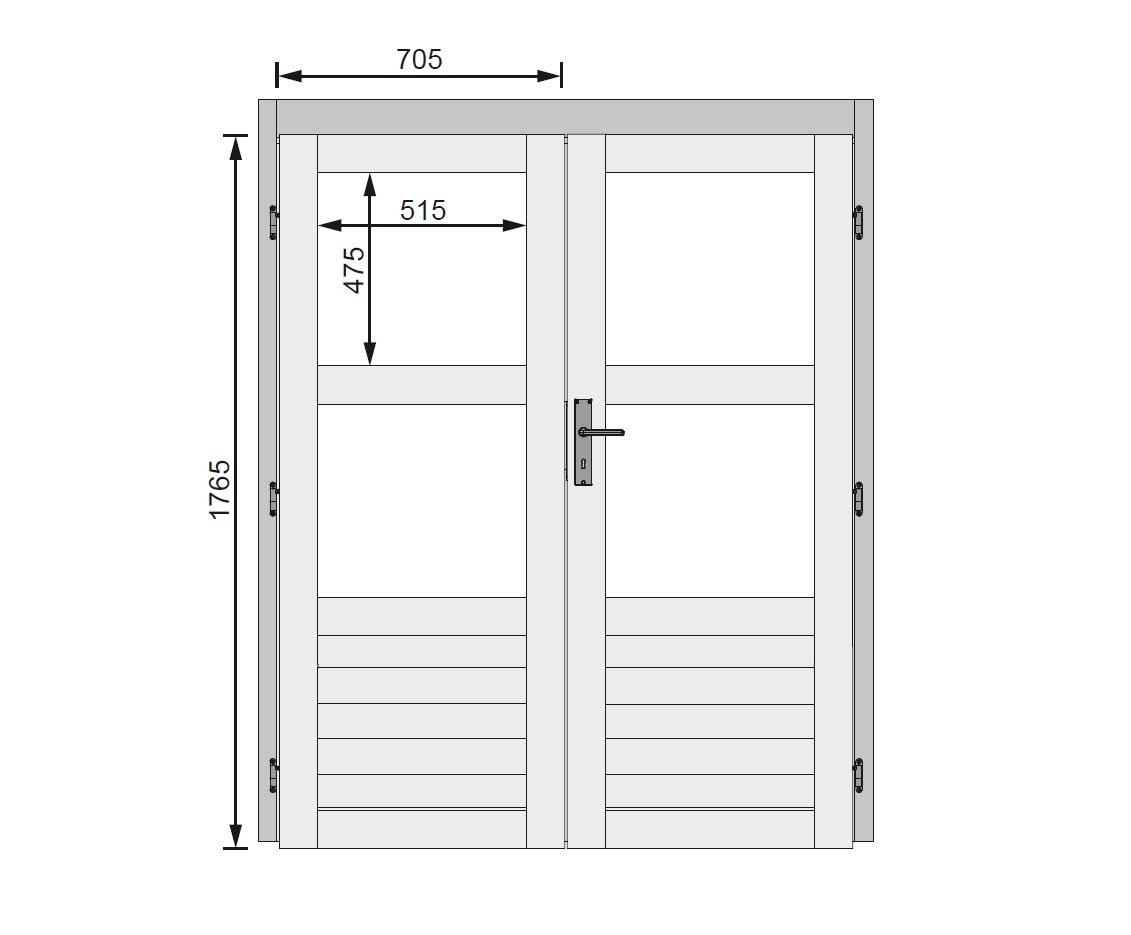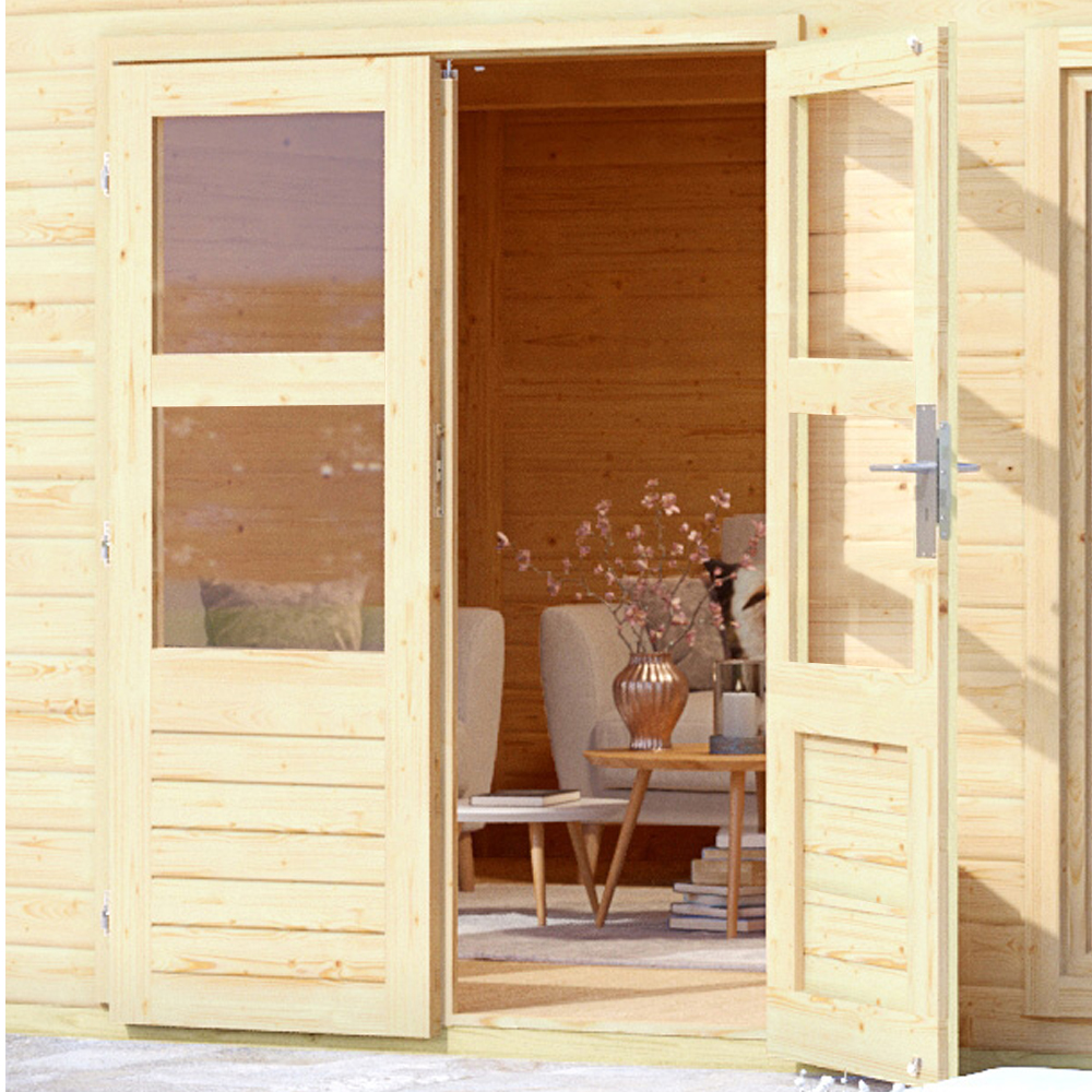 Passen Sie Ihr Gartenhaus Ihren Gegebenheiten an. Die Doppelflügeltür für Gartenhäuser für eine Wandstärke von 28 mm hat ein Außenmaß von (BxH) 141 x 177 cm. Das Lochmaß mit Zarge beträgt 178,5 x 148,4 cm. Die Tür wird inklusive eines Türrahmens, Buntbartschloss mit 2 Schlüsseln, Beschläge, Türschnapper etc. geliefert. Verschlossen werden kann die Doppelflügeltür mithilfe eines Buntbarschloss inklusive zwei Schlüsseln. So können Sie Ihr Gartenhaus als Durchgang nutzen und es von zwei Seiten begehbar machen. Oder Sie benötigen für Ihr eigenes DIY Projekt eine Extra Tür, wir haben das richtige Produkt für Sie. Die Tür besitzt zwei Lichtausschnitte je Türflügel aus Kunstglas und ist in naturbelassen erhältlich.