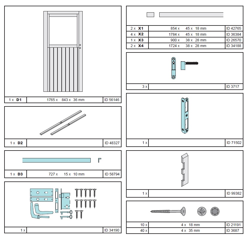 Die Tür wird inklusive eines Türrahmens, Holz-Türschwelle, Bundbartschloss mit 2 Schlüsseln und Beschläge etc. geliefert. Verschlossen werden kann die Einflügeltür mithilfe eines Bundbartschlosses inklusive zwei Schlüsseln. So können Sie Ihr Gartenhaus als Durchgang nutzen und es von zwei Seiten begehbar machen. Oder Sie benötigen für Ihr eigenes DIY Projekt eine Extra Tür, wir haben das richtige Produkt für Sie. Die Tür besitzt ein Lichtausschnitt aus Kunstglas und ist in elfenbeinweis (RAL1015) erhältlich.