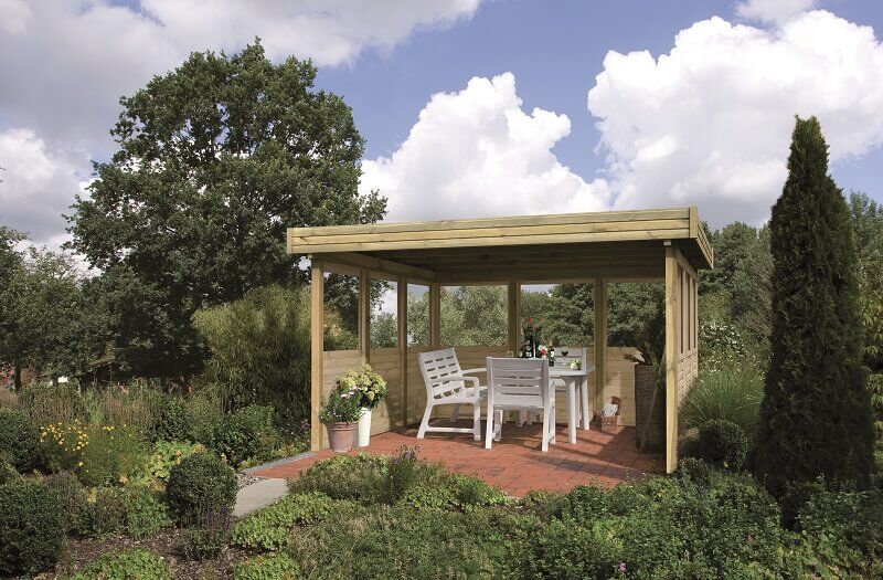 Die besten Eigenschaften beim Holzpavillon sehen Sie auf den ersten Blick. Der natürliche Rohstoff Holz wirkt auf Menschen beruhigend und schafft eine angenehm entspannte Atmosphäre. Das ist die beste Grundlage für erholsame Stunden im grünen Wohnzimmer. Zudem fügt sich das Material sehr harmonisch in die Gartengestaltung ein und verschmilzt auf attraktive Weise mit der Bepflanzung. Pflanzen wie Efeu nutzen das Holz gern als Rankhilfe und verleihen dem Holzpavillon einen märchenhaften Charme.