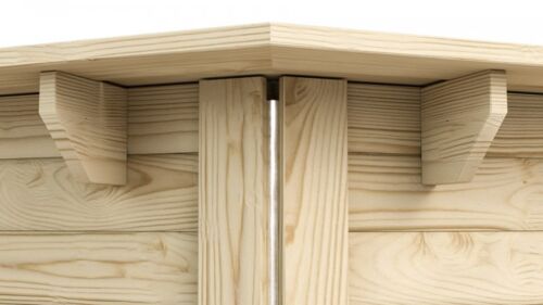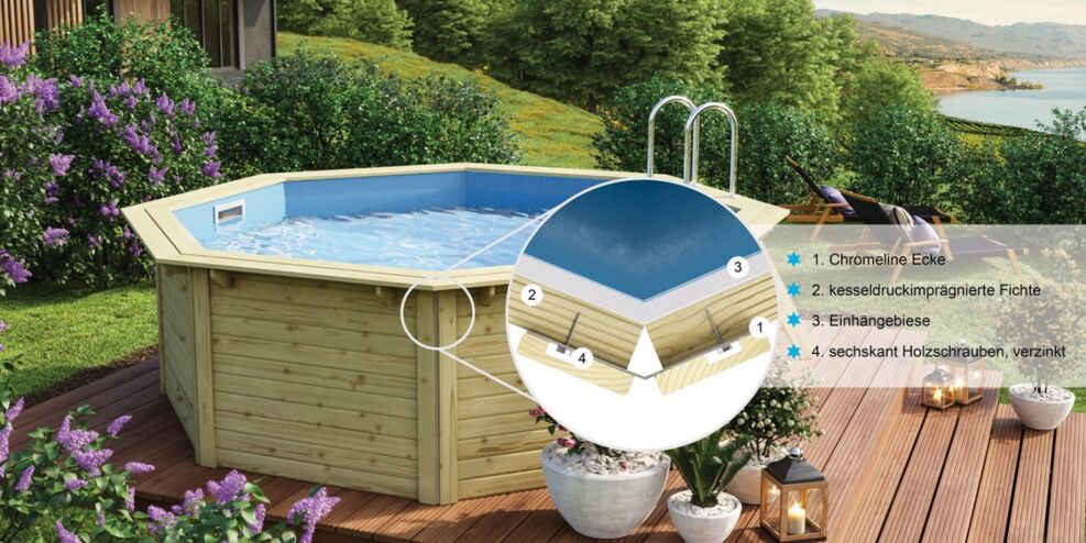 Die Seitenwände (je nach Modell 38 Millimeter oder 44 Millimeter stark) setzen sich bei dieser Bauweise aus einzelnen Bohlen zusammen, die bei der Montage einfach aufeinander gesteckt werden. Dank modernster Frästechnik sitzen Nut und Feder perfekt aufeinander. Die Achteck-Pools von Karibu in der Blockbohlenbauweise werden aus kesseldruckimprägniertem Fichtenholz hergestellt.