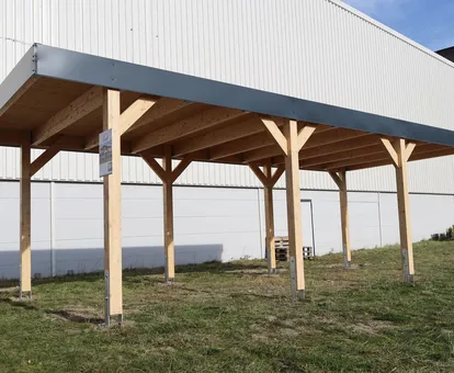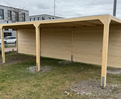 Aus hochwertigem Leimholz 12x12cm starke Pfosten aus Massivholz/Leimholz Flachdach mit 1° Dachneigung 140 kg/qm Schneelast 222 cm Durchfahrtshöhe / Durchfahrtsbreite 290 cm Anthrazitfarbene Metallblende am Dach Mit Wandelementen kombinierbar Inkl. Dachrinne und Fallrohr