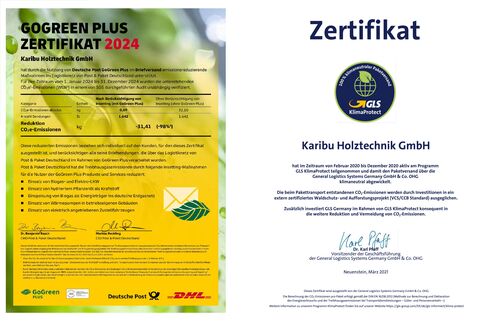 Karibu setzt sich gemeinsam mit seinen Partnern für einen möglichst ressourcenschonenden Versand ein. Gemeinsam mit dem GLS Paketversand haben wir uns im Jahr 2020 am Programm GLS Klimaprotect beteiligt. Dabei werden die beim Versand entstehenden CO₂-Emissionen durch Investitionen in Waldschutz- und Aufforstungsprojekte kompensiert. Die Wiederverwendung von Rohstoffen ist ein wesentlicher Bestandteil unserer Bemühungen, möglichst ressourcenschonend zu arbeiten. Aus diesem Grund schreddern wir Altkartonage, um daraus Füllmaterial für unsere Pakete herzustellen. Zudem nutzen wir für einen Teil unserer Sendungen das Versandprogramm DHL GoGreen Plus. Dieses Programm unterstützt Maßnahmen zur Reduktion und Kompensation von Transportemissionen.