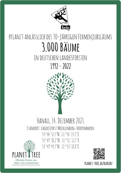 Gemeinsam mit Planet Tree hat Karibu Holztechnik GmbH anlässlich des 30-Jährigen Jubiläums 3.000 Bäume in Wäldern von Mecklenburg-Vorpommern gepflanzt. Zukünftig sollen es noch mehr werden, um die Aufforstung in den deutschen Wäldern zu unterstützen. Genaue Informationen zu den Standorten der Bepflanzung gibt es hier.