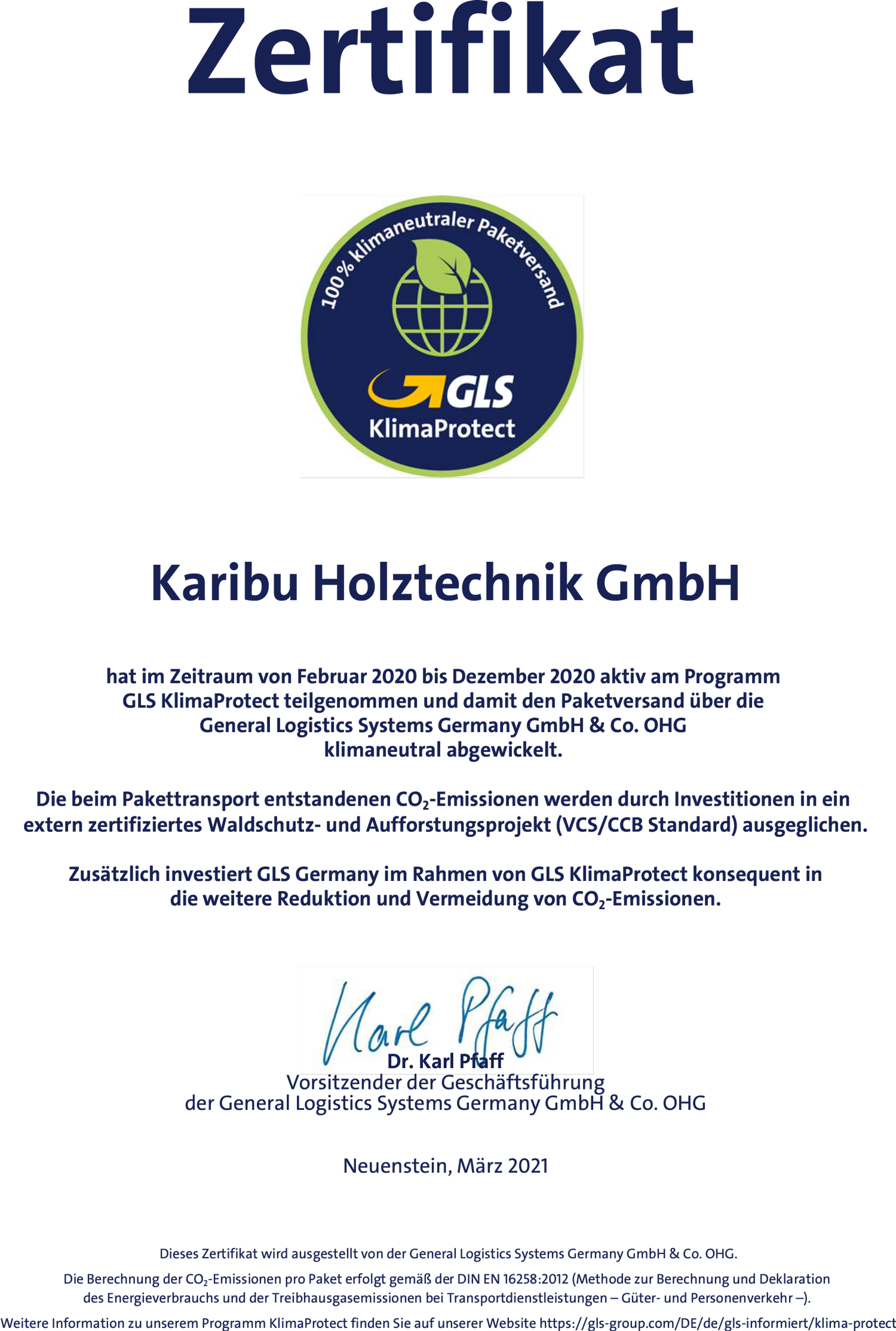 Klicke hier für das vollständige GLS Zertifikat.
